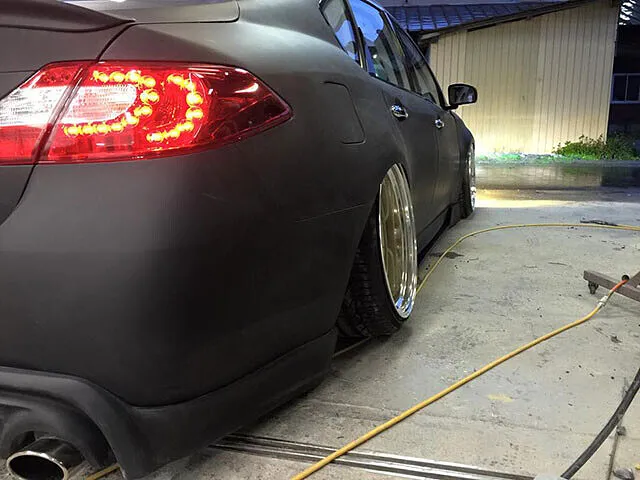 お客様からのご依頼で、車高を調整してカッコよくしました。もちろん、車検に通るための高さは確保しています。違法改造にならないよう細心の注意をはらっています。