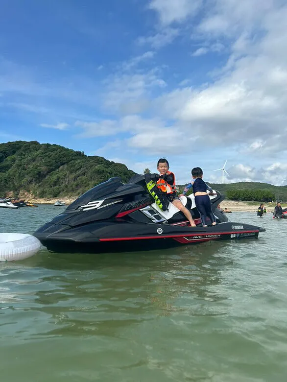 青空の下、ジェットスキーに乗って笑顔を見せる子どもたち。